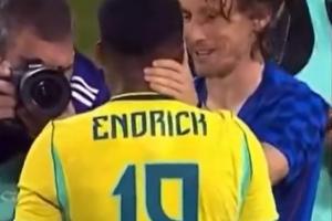 赛后,19岁恩德里克抱起40岁的莫德里奇,莫德里奇和恩德里克拥抱聊了一会。